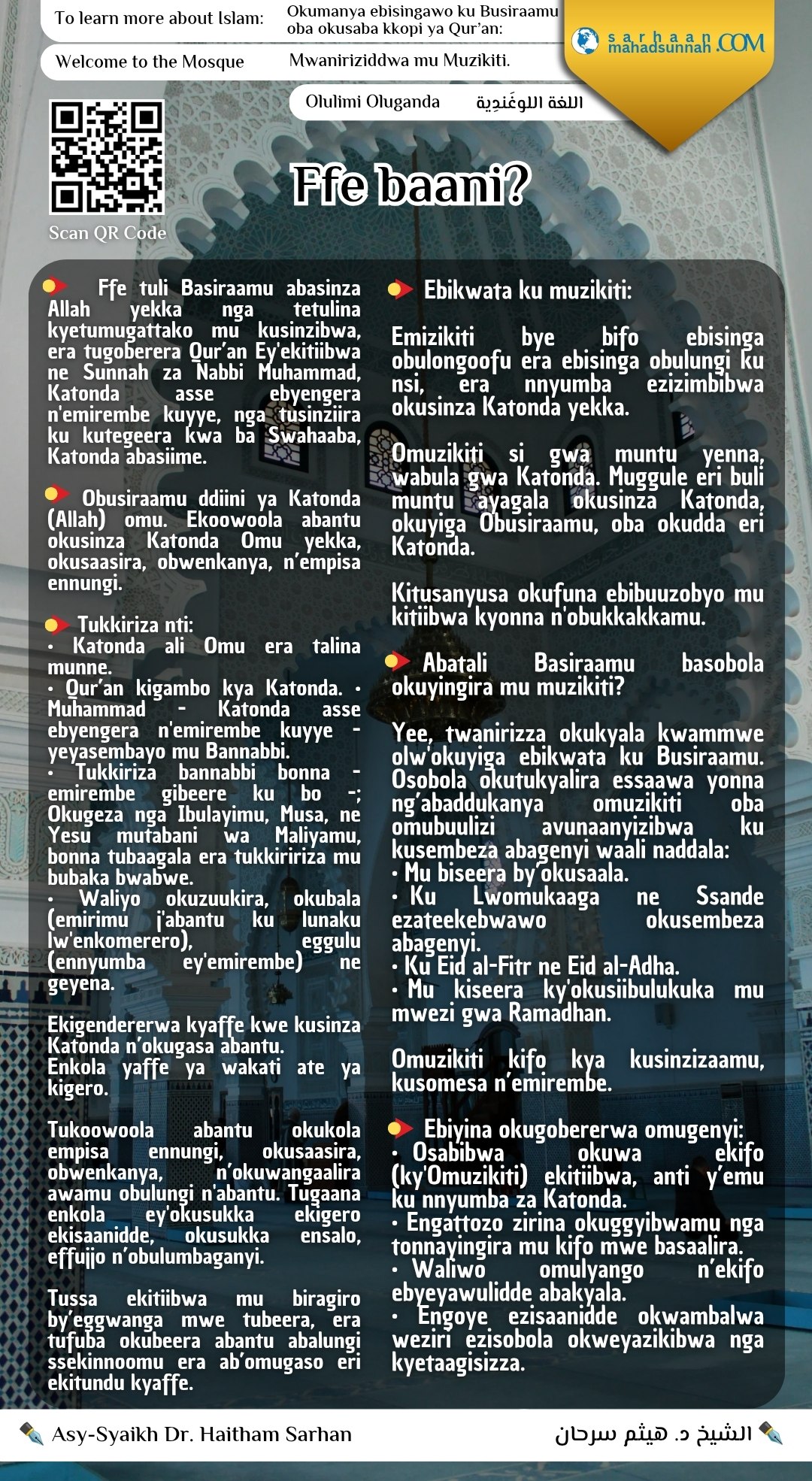 من نحن ؟ *اللغة: اللوغَندِية* Ffe baani? Ffe tuli Basiraamu abasinza Allah yekka nga tetulina kyetumugattako mu kusinzibwa, era tugoberera Qur’an Ey’ekitiibwa ne Sunnah za