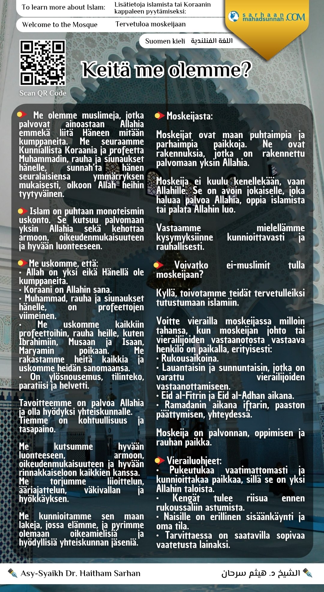 من نحن؟ اللغة الفنلندية Suomi 📌 Tyylikäs da‘wah-esittelytaulu otsikolla ”Keitä me olemme?”, suunniteltu esittelemään vierailijoille islamin todellinen olemus, sen usko, sanoma ja moraali sekä selittämään