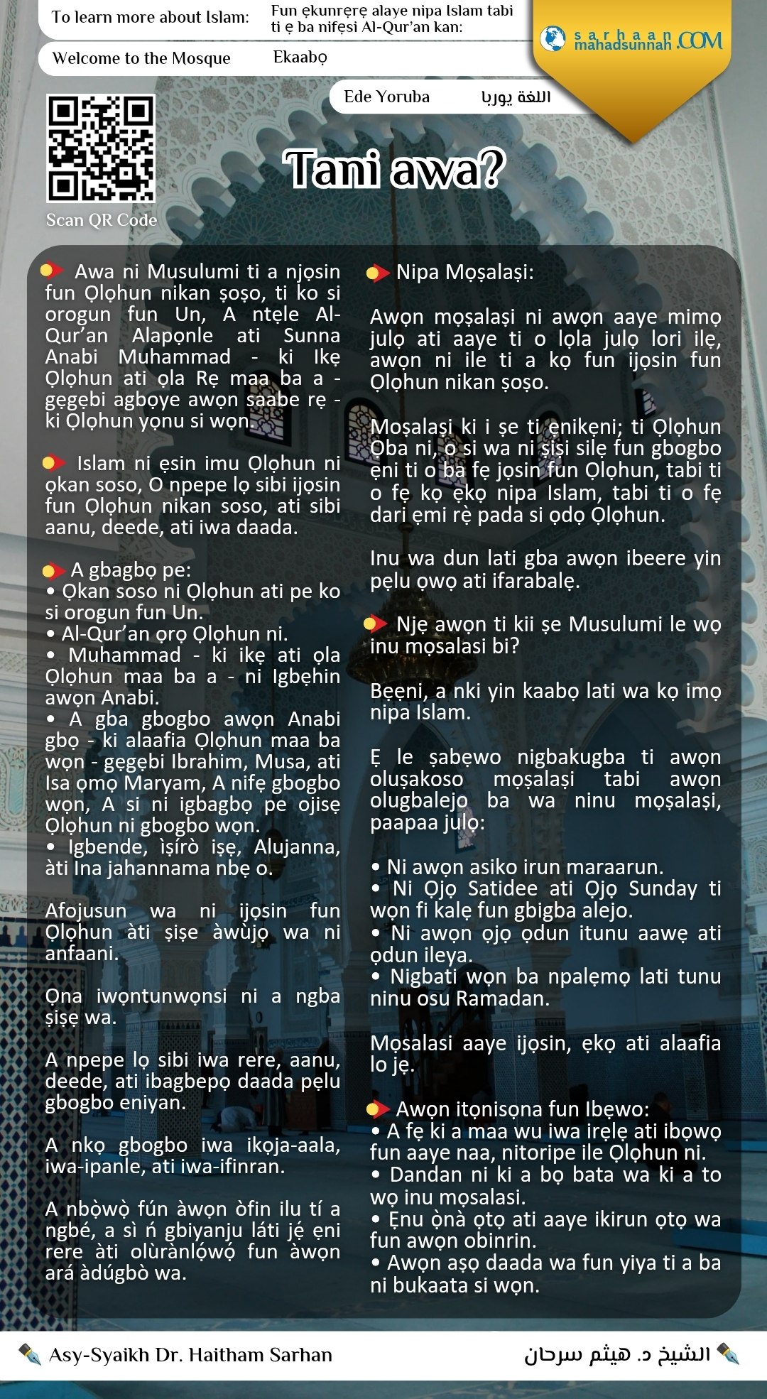 من نحن؟ Ede Yoruba Tani awa? Awa ni Musulumi ti a njọsin fun Ọlọhun nikan ṣoṣo, ti ko si orogun fun Un, A ntẹle Al-Qur’an