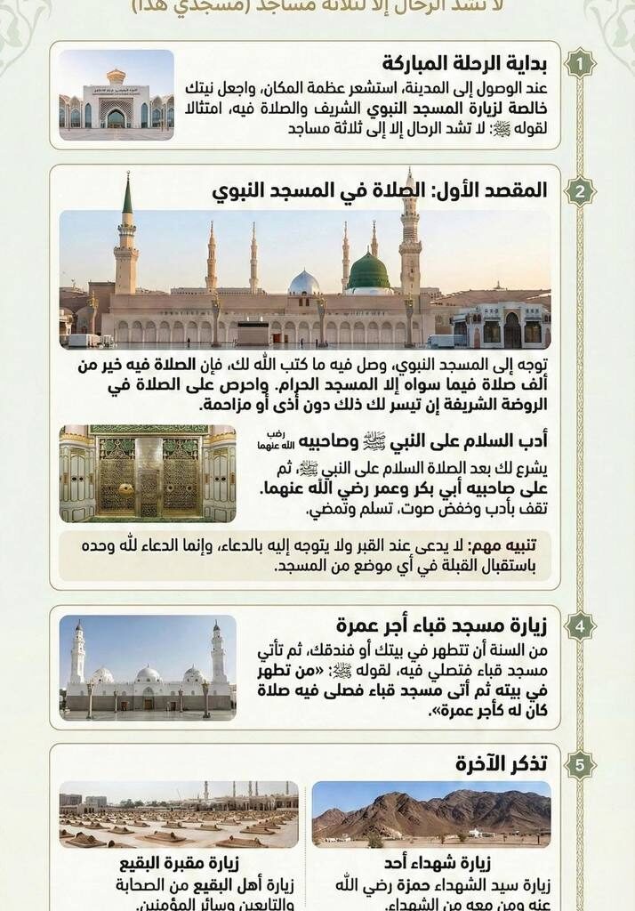 «لا تُشدُّ الرِّحالُ إلا إلى ثلاثةِ مساجدَ، مسجدي هذا…» المحطة 1 بداية الرحلة المباركة عند الوصول إلى المدينة المنورة، استشعر عظمة المكان، واجعل نيتك خالصة