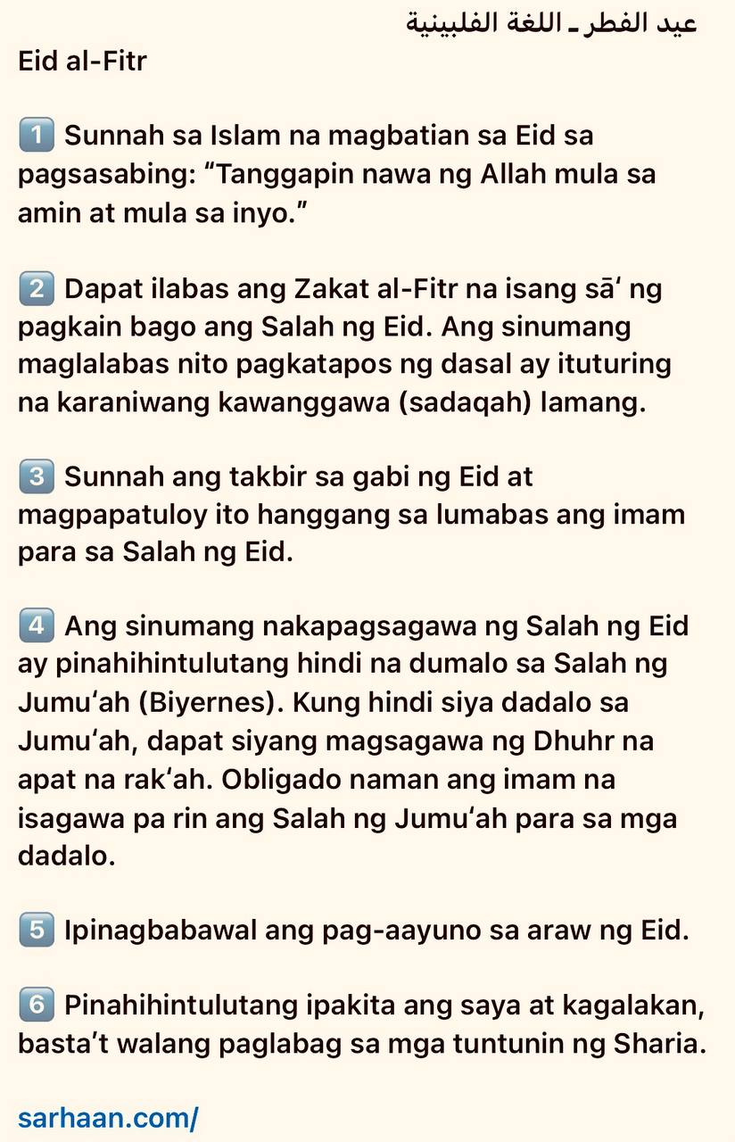 عيد الفطر ـ اللغة الفلبينية Eid al-Fitr 1️⃣ Sunnah sa Islam na magbatian sa Eid sa pagsasabing: “Tanggapin nawa ng Allah mula sa amin at