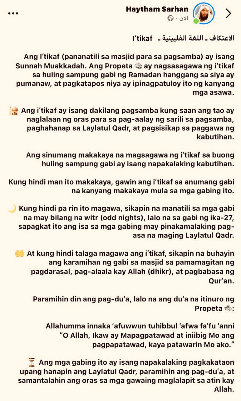 Ang I‘tikaf (pananatili sa masjid para sa pagsamba) ay isang Sunnah Muakkadah. Ang Propeta ﷺ ay nagsasagawa ng i‘tikaf sa huling sampung gabi ng Ramadan
