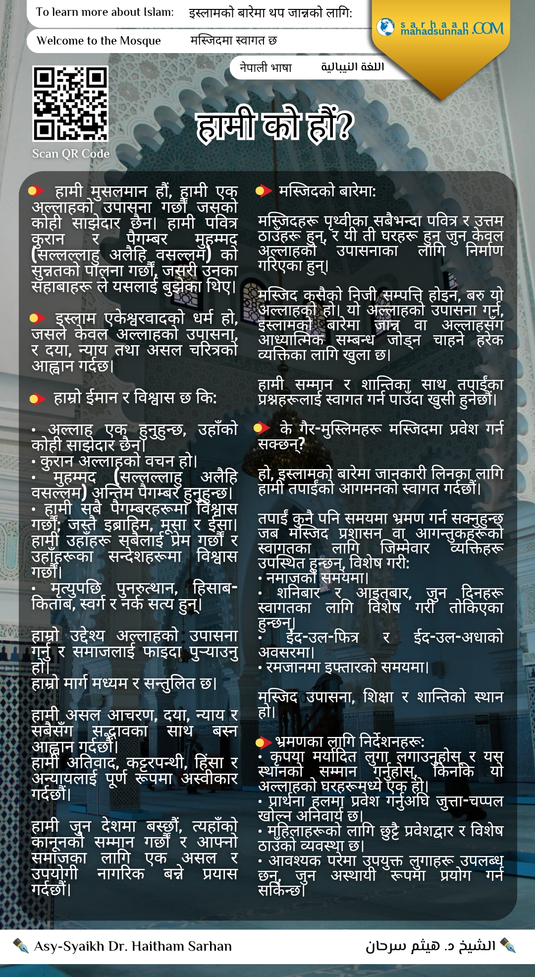 من نحن؟ اللغة النيبالية नेपाली 📌 “हामी को हौं?” शीर्षक भएको एक सुन्दर दावत परिचयात्मक बोर्ड, जसलाई आगन्तुकहरूलाई इस्लामको वास्तविक सार, यसको आस्था, सन्देश र