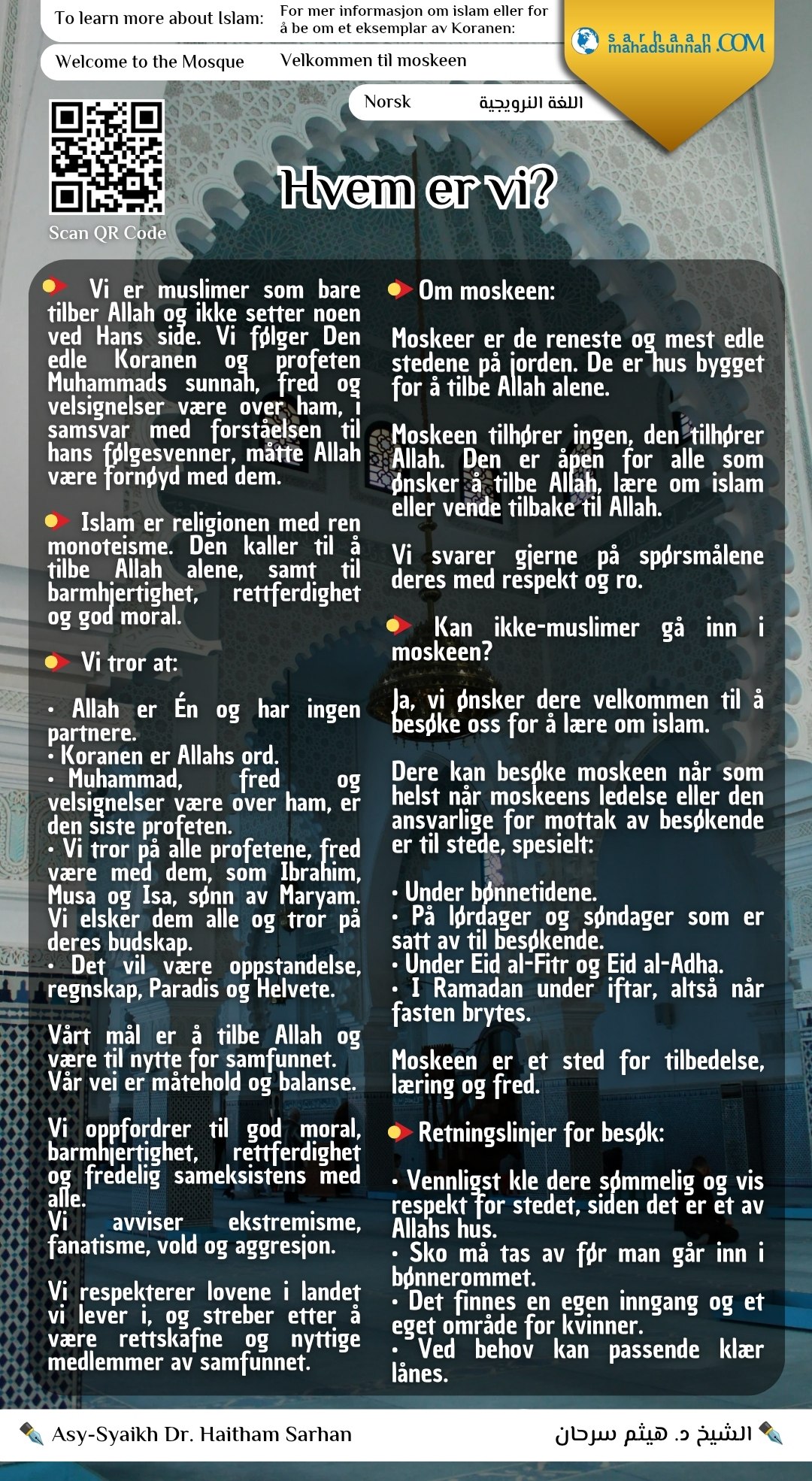 من نحن؟ اللغة النرويجية Norsk 📌 En elegant informasjonsplakat for da‘wah med tittelen «Hvem er vi?», utformet for å gjøre besøkende kjent med islams sanne