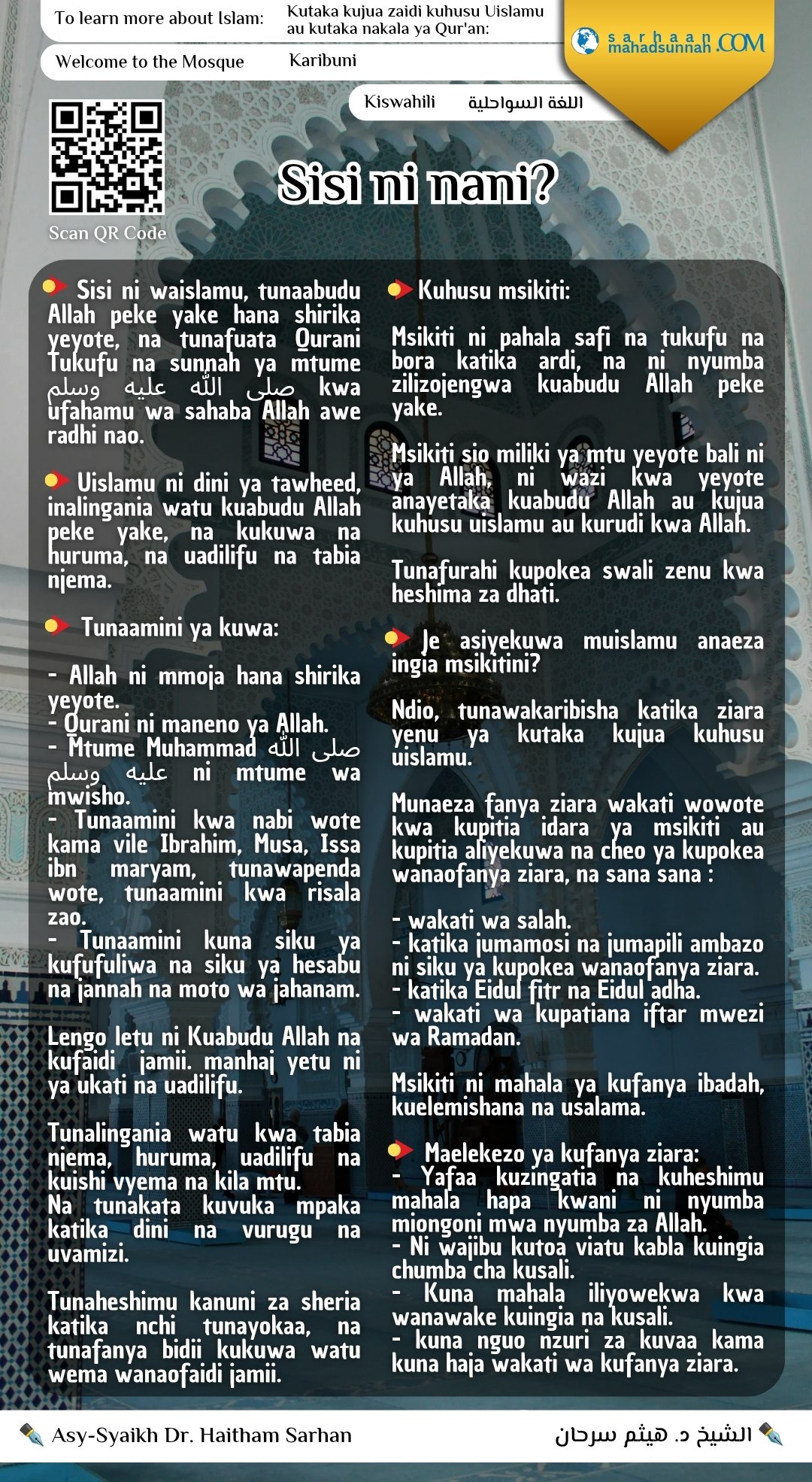 من نحن؟ اللغة السواحلية Kiswahili 📌 Bango zuri la utambulisho wa da‘wah lenye kichwa “Sisi ni nani?”, limeundwa kuwafahamisha wageni kuhusu ukweli wa Uislamu, itikadi