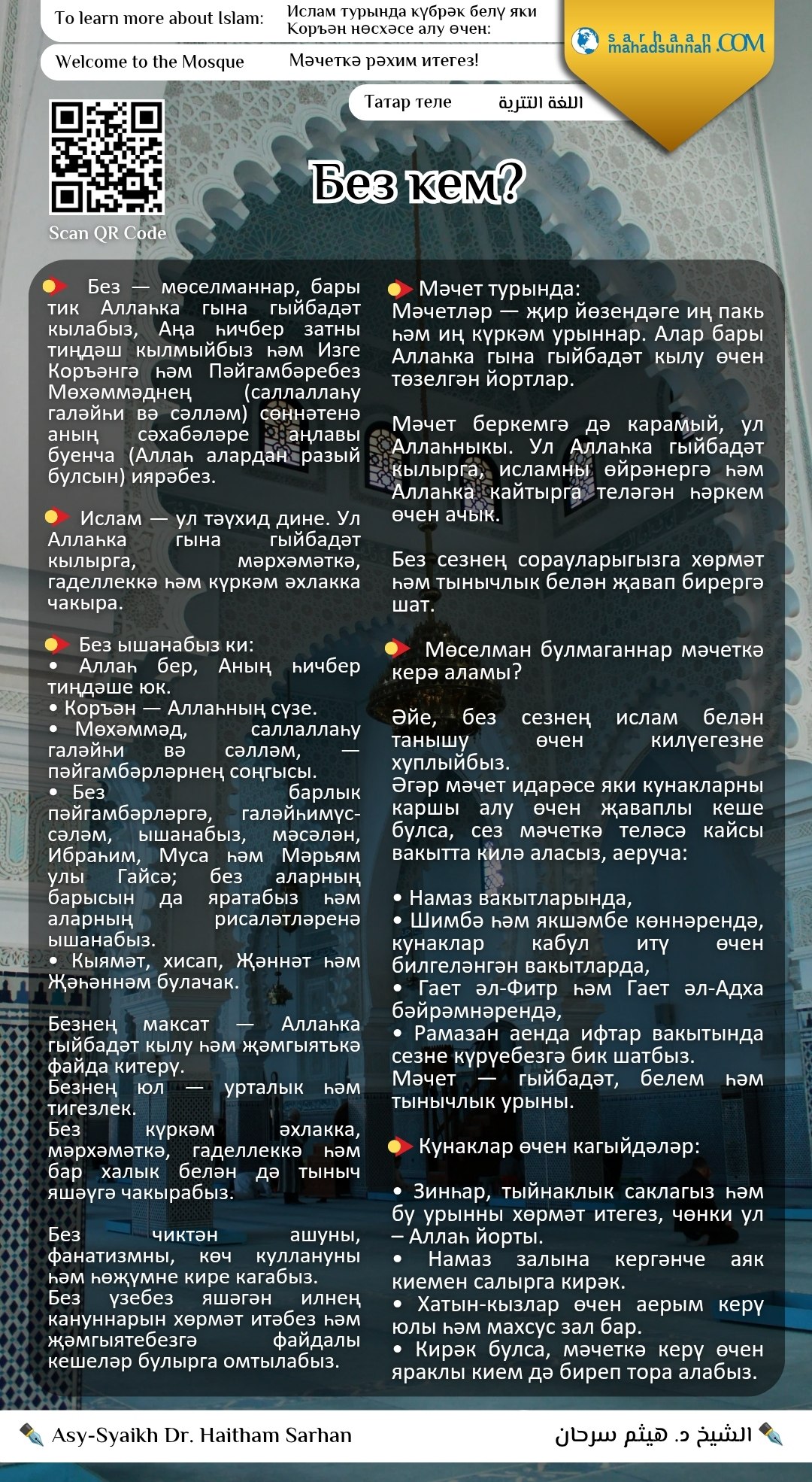 من نحن؟ اللغة التترية Татарча 📌 «Без кем без?» исемле зәвыклы да‘уәт таныштыру тактасы, ул кунакларны Исламның чын асылы, аның ышанулары, хәбәре һәм әхлагы белән