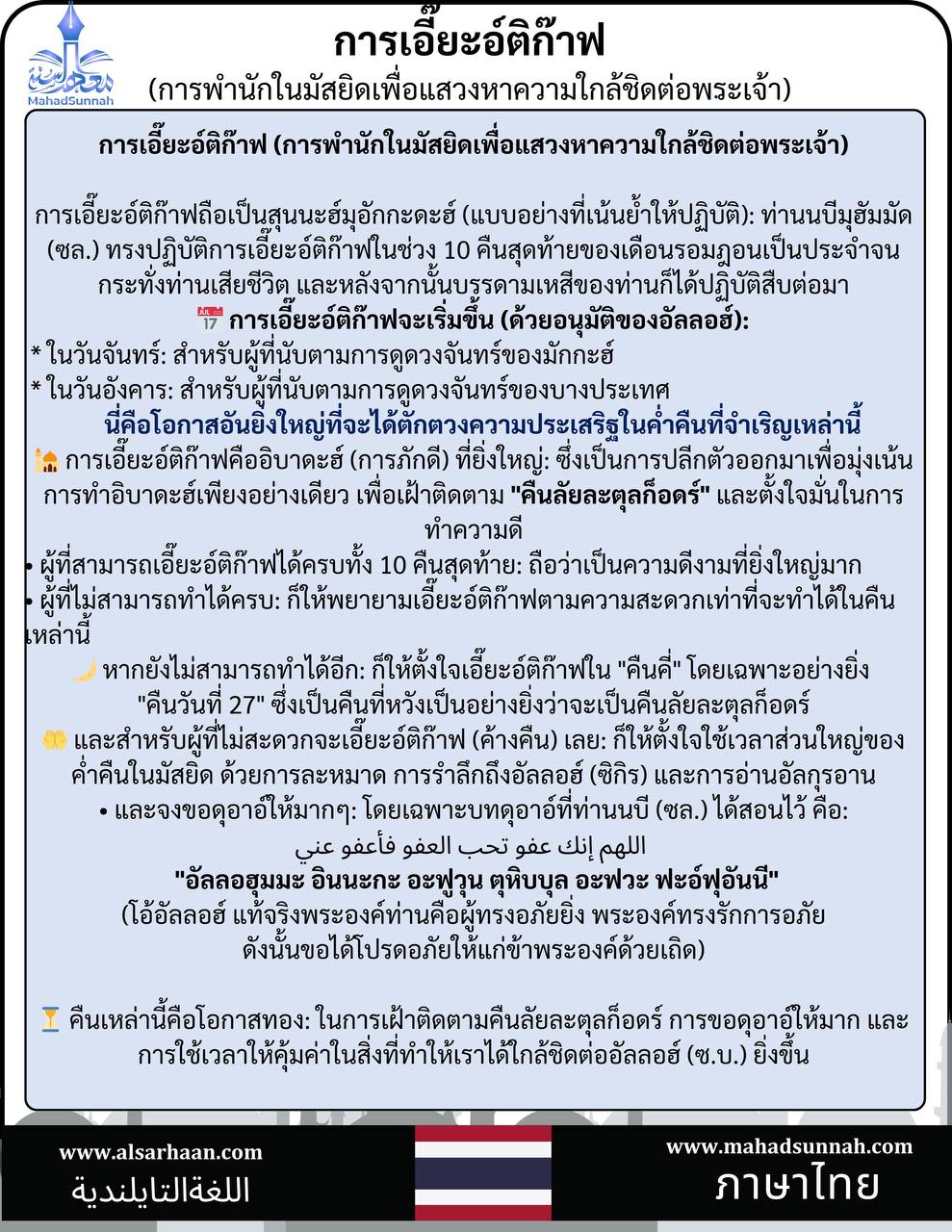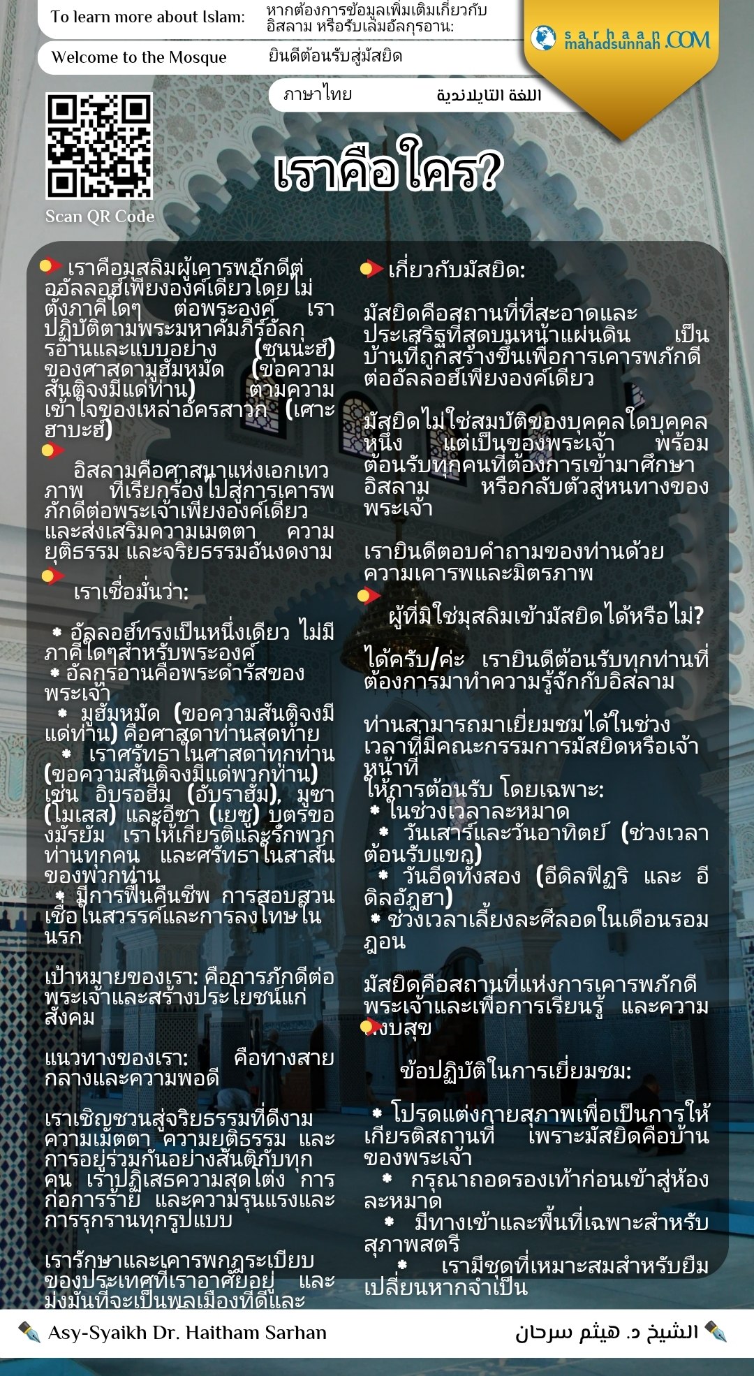 من نحن؟ اللغة التايلاندية (ภาษาไทย) เราคือใคร? เราคือมุสลิมผู้เคารพภักดีต่ออัลลอฮ์เพียงองค์เดียวโดยไม่ตั้งภาคีใดๆ ต่อพระองค์ เราปฏิบัติตามพระมหาคัมภีร์อัลกุรอานและแบบอย่าง (ซุนนะฮ์) ของศาสดามูฮัมหมัด (ขอความสันติจงมีแด่ท่าน) ตามความเข้าใจของเหล่าอัครสาวก (เศาะฮาบะฮ์) อิสลามคือศาสนาแห่งเอกเทวภาพ ที่เรียกร้องไปสู่การเคารพภักดีต่อพระเจ้าเพียงองค์เดียว และส่งเสริมความเมตตา ความยุติธรรม และจริยธรรมอันงดงาม เราเชื่อมั่นว่า: * อัลลอฮ์ทรงเป็นหนึ่งเดียว ไม่มีภาคีใดๆสำหรับพระองค์ * อัลกุรอานคือพระดำรัสของพระเจ้า