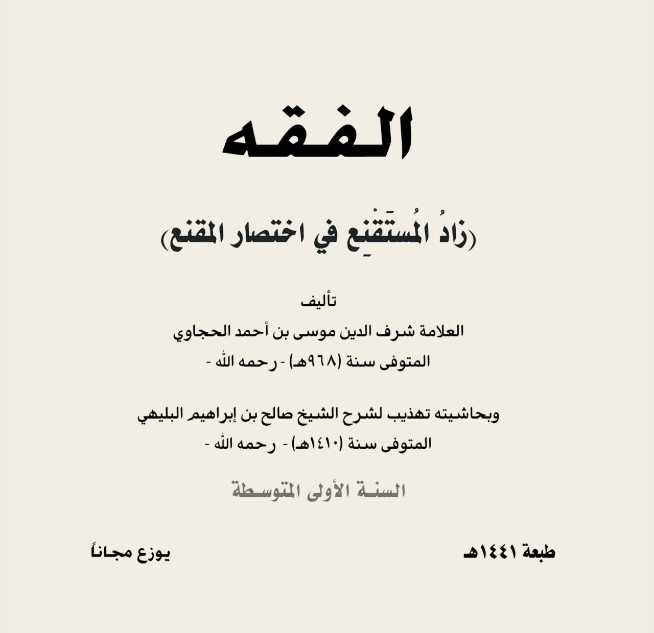 مقرر دراسي في الفقه للسنة الأولى المتوسطة، يعتمد متن زاد المستقنع للإمام شرف الدين موسى بن أحمد الحجاوي رحمه الله، مع حاشية تهذيب لشرح الشيخ صالح بن إبراهيم البليهي رحمه الله. يقدّم الكتاب مسائل الفقه بأسلوب مختصر ومنظّم وفق المذهب الحنبلي، مع بيان أهم الأحكام المتعلقة بالعبادات والمعاملات، بما يناسب مستوى طلاب المرحلة المتوسطة ويؤسس لديهم الفهم الصحيح للمسائل الفقهية.