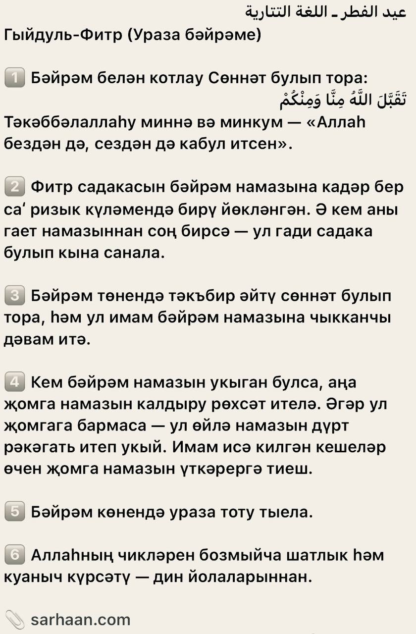 2️⃣ Фитр садакасын бәйрәм намазына кадәр бер са‘ ризык күләмендә бирү йөкләнгән. Ә кем аны гает намазыннан соң бирсә — ул гади садака булып кына санала.