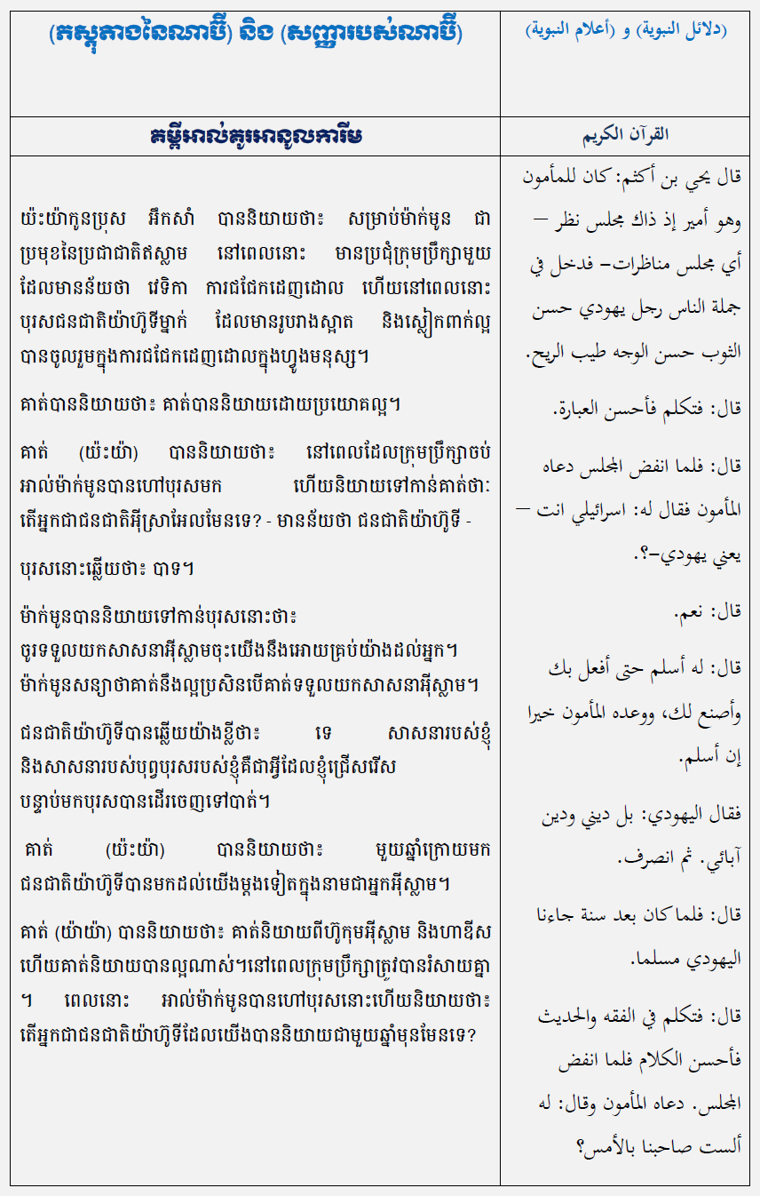 دلائل النبوة كمبودية តស្តុតាងនៃណាប៊ី សញ្ញារបស់ណាប៊ី យ៉ះយ៉ាកូនប្រុស អឹកសាំ បាននិយាយថា៖ សម្រាប់ម៉ាក់មូន ជា ប្រមុខនៃប្រជាជាតិឥស្លាម នៅពេលនោះ មានប្រជុំក្រុមប្រឹក្សាមួយ ដែលមានន័យថា វេទិកា...