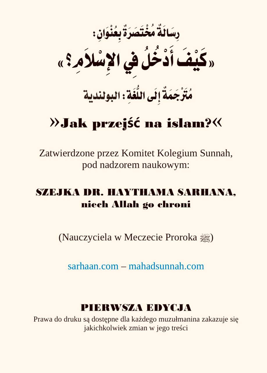 Krótka broszura wyjaśniająca, jak człowiek może przyjąć islam, jakie pierwsze kroki powinien podjąć po jego przyjęciu oraz jakie podstawy nowy muzułmanin powinien stopniowo poznawać. Zawiera jasne i praktyczne wprowadzenie do religii.