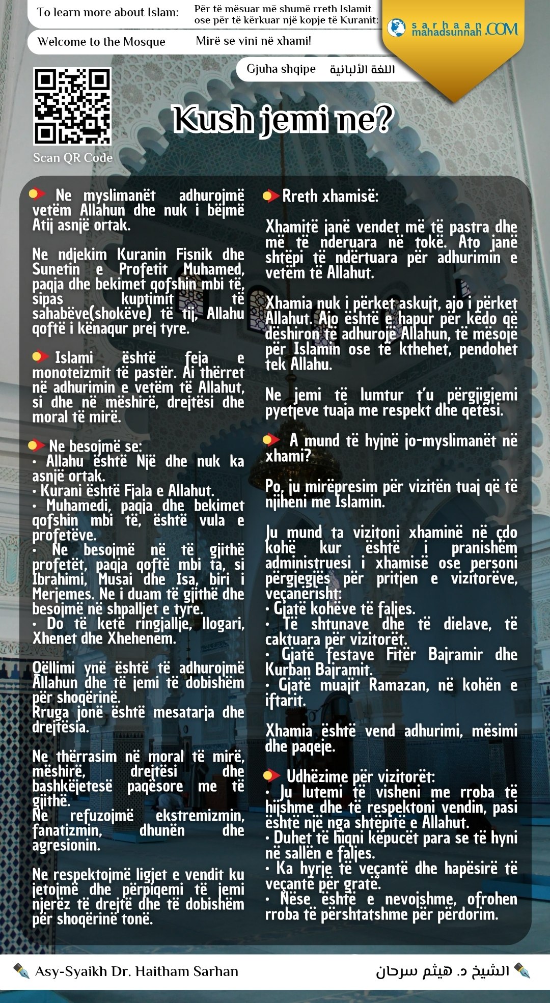 📖 Përmban përgjigje të shkurtra dhe të qarta rreth Islamit, si dhe udhëzime për vizitën, së bashku me një kod QR për qasje të shpejtë në burime të besueshme.