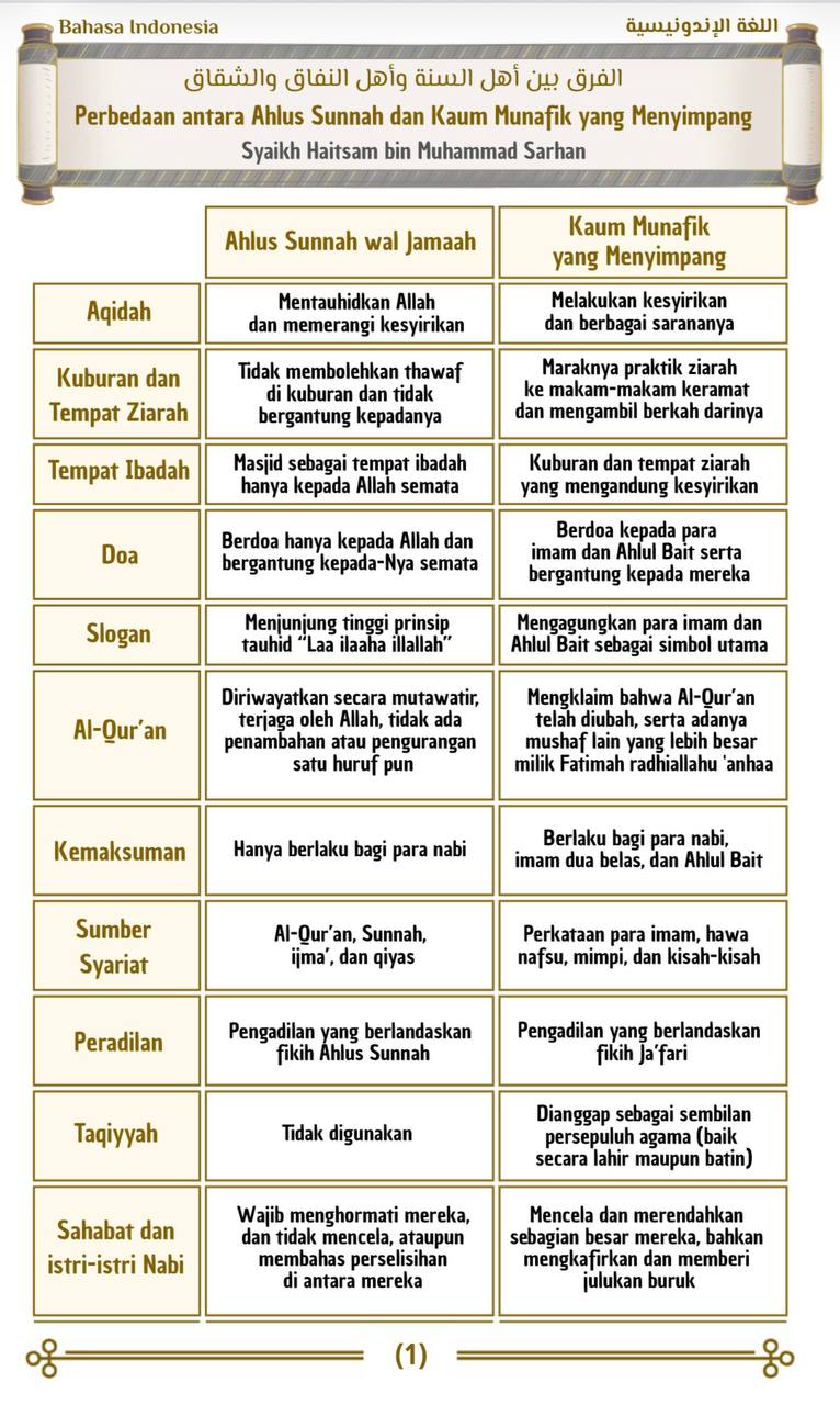 Sebuah poster ilmiah ringkas yang menjelaskan perbedaan manhaj antara Ahlus Sunnah wal Jamaah dan kaum munafik yang menyimpang, dari sisi aqidah, ibadah, sumber syariat, serta sikap terhadap Al-Qur’an dan para sahabat. Disusun secara sistematis agar mudah dipahami, serta menegaskan prinsip-prinsip Ahlus Sunnah yang berlandaskan tauhid dan ittiba’ (mengikuti sunnah), sekaligus memperingatkan dari penyimpangan akidah dan bid’ah.
