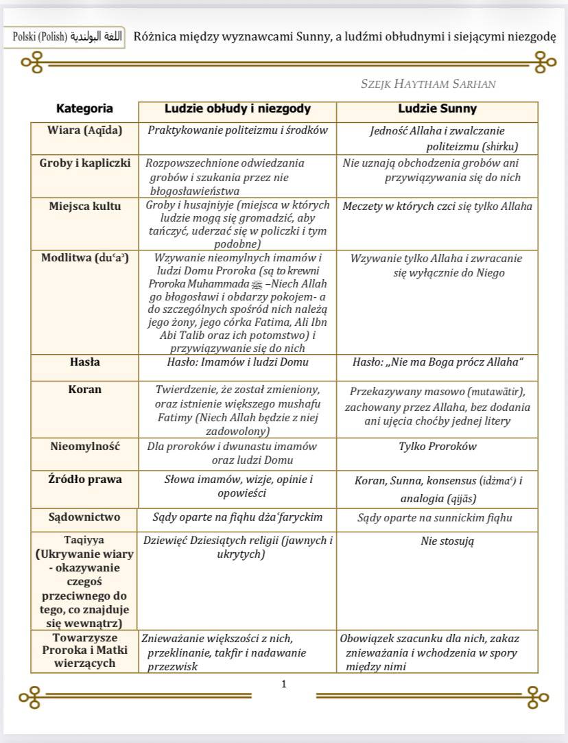 Krótka tablica naukowa przedstawiająca różnice metodologiczne między ludźmi Sunny i wspólnoty a ludźmi obłudy i rozłamu – pod względem doktryny wiary, form kultu, źródeł ustawodawstwa oraz podejścia do Koranu i towarzyszy Proroka – w uporządkowanym stylu, który ułatwia zrozumienie i ukazuje podstawy ludzi Sunny oparte na tauhidzie (jedyności Allaha) i podążaniu za nim, a także ostrzega przed odchyleniami w wierze i innowacjami.