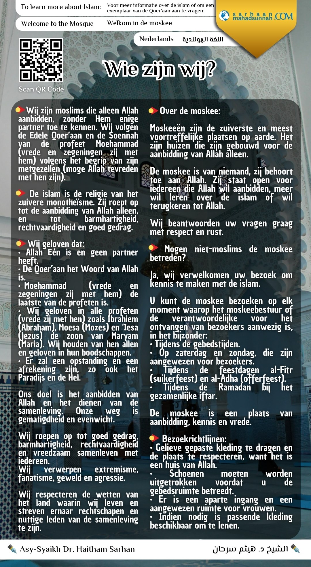 📖 Het bevat duidelijke en beknopte antwoorden over de islam, evenals richtlijnen voor bezoekers, en een QR-code voor snelle toegang tot betrouwbare bronnen.