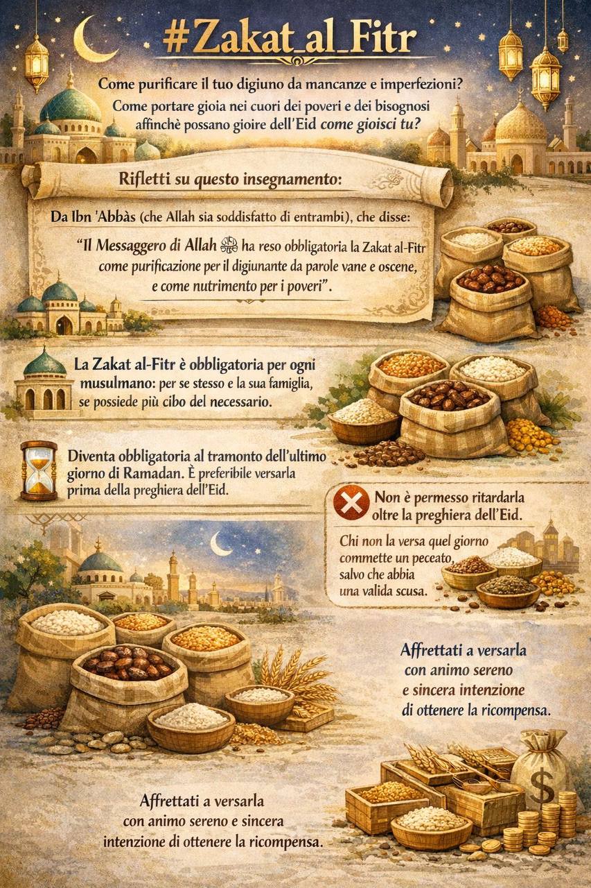 زكاة الفطر اللغة الإيطالية (Italiano): #Zakat_al_Fitr Come purificare il tuo digiuno da mancanze e imperfezioni? Come portare gioia nei cuori dei poveri e dei bisognosi affinché possano gioire dell’Eid come gioisci tu? 📖 Rifletti su questo insegnamento: Da Ibn ʿAbbās (che Allah sia soddisfatto di entrambi), che disse: «Il Messaggero di Allah ﷺ ha reso obbligatoria la Zakat al-Fitr come purificazione per il digiunante da parole vane e oscene, e come nutrimento per...